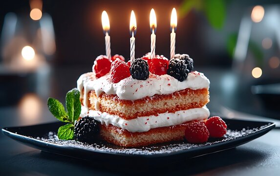 Beautiful, elegant birthday cake with flowers and candles. Generative AI.