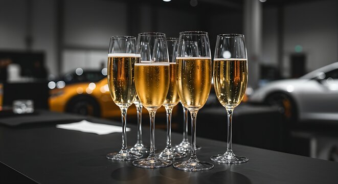 Elegant champagne flutes filled with a light-colored sparkling wine on a bar counter, with a blurred car show and luxury sports cars in the background.