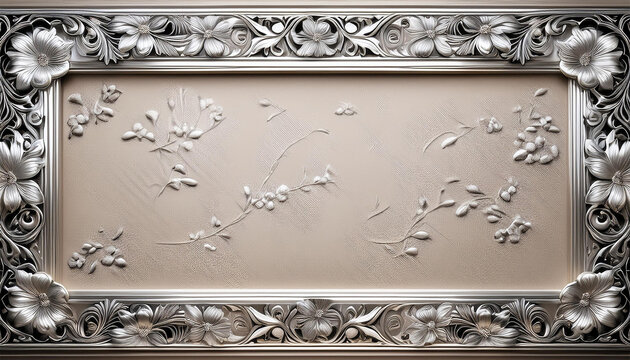 elegant silver frame with floral decorations on a beige textured background providing copy space for design and customization