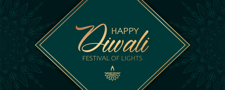 Golden text Happy Diwali, festival of lights, diya lamp and abstract floral mandala decorations on green background. Elegant festive banner design for hindu festival Diwali.