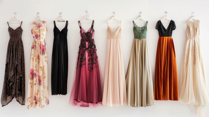 Elegant collection of stylish dresses displayed against a sophisticated white background in a well-lit setting
