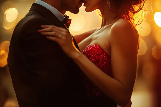 Sexy young elegant couple at the Party. Woman wearing golden dress and man in classic suit