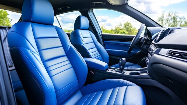 Close-up of Blue Leather Car Seats Interior - Luxury car interior, blue leather seats, modern design, comfort, driving experience. Symbolizes elegance, sophistication, speed, freedom, and luxury