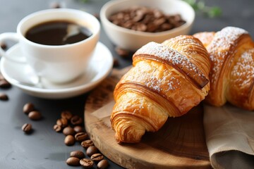 A rustic breakfast spread of a freshly baked croissant and steaming cup of coffee on a wooden board, complete with elegant serveware and cozy indoor vibes