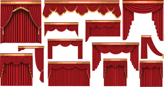 Curtain, Stage, Red, Gold, Tassel, Theater, Drapes, Closed, Open, Swag, Valance, Collection, Design, Fabric, Classic, Elegant, Performance, Backdrop, Illustration, Decorative, Style