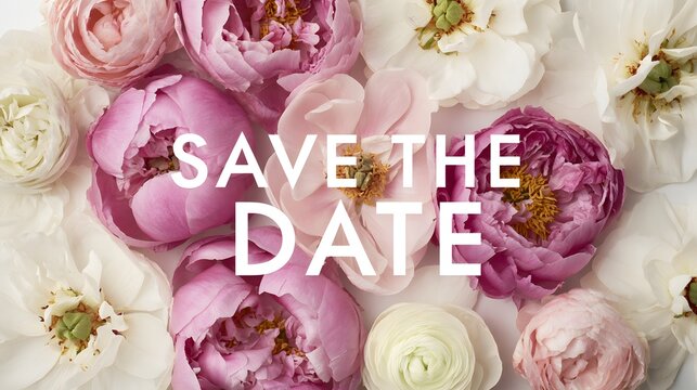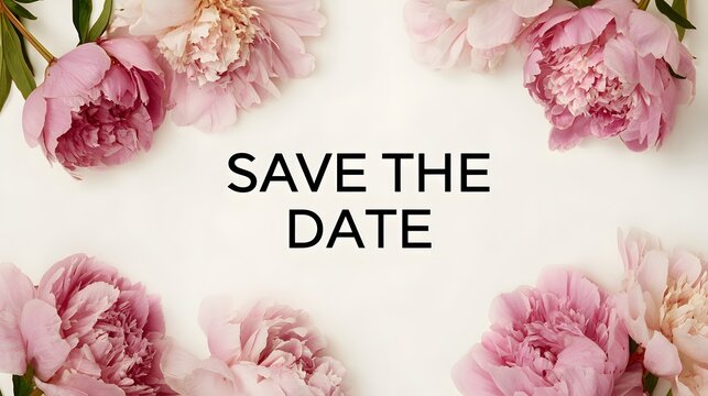 Save the Date Wedding Invitation Template with Pink Peony Floral Border. Elegant Spring Celebration Concept.