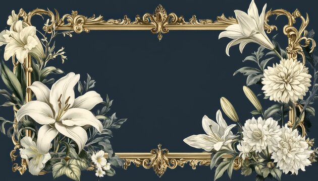 Elegant black frame with gold edging. White flowers decorate frame corners. Blank space ideal for text. Funeral invitation design template. Memorial service announcement. Grief support resource.