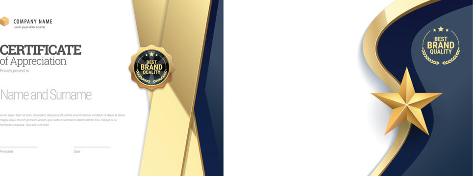 Award certificate with a star design in blue and gold colors. Horizontal template Diploma of modern design or gift certificate. Vector illustration.