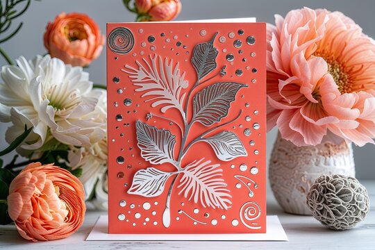Warm Coral Trendy Card with Whimsical Patterns and Silver Foil Accents