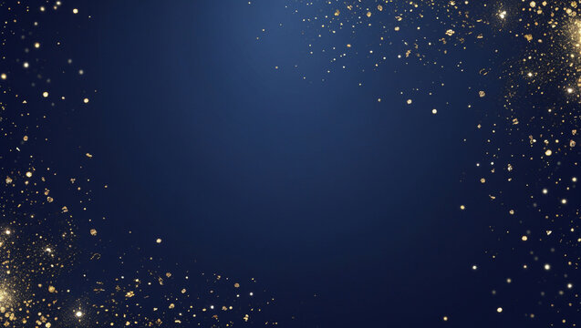Gold glitter sparkle confetti dust particles on dark blue background abstract luxury and elegant backdrop design