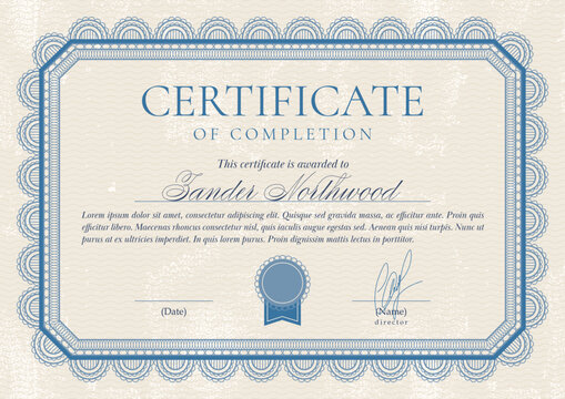 Certificate or diploma in vintage style and blue colors. Frame borders design. Simple Vector illustration