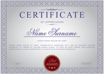 certificate of horizontal format in a classic elegant style with a beautiful ornamental frame (in gray and blue tones)