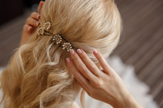 Wedding hairstyle, manicure and jewelry. Blonde bride adjusts her hairstyle at wedding day
