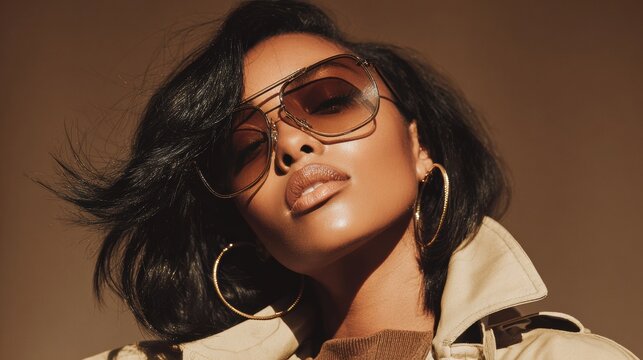 Portrait of an elegant woman with flowing dark brown hair, soft makeup, and a confident expression, depicted against a gray studio backdrop.