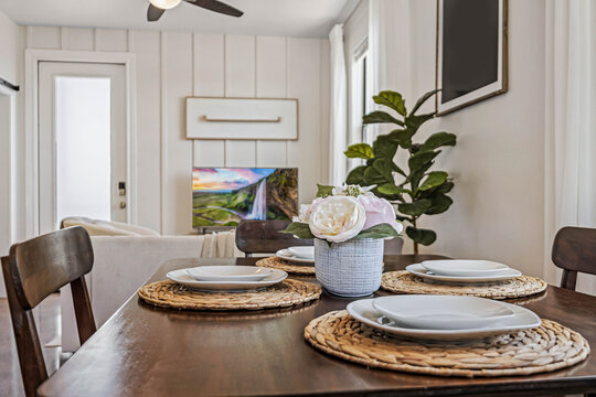 Luxury home dining room and kitchen interior with natural rustic modern deisgn.
