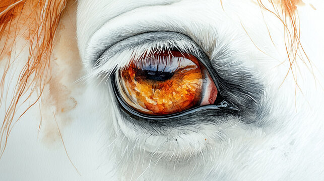 Closeup amber eye of a white horse watercolor painting detailed artistic animal. hair