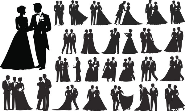 Wedding couple silhouette collection, bride groom pose vector, romantic marriage illustration, elegant formal outfit, love ceremony icon set
