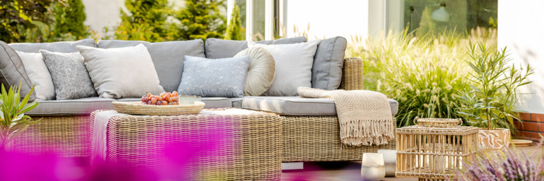 Tropical Home with White Walls, Green Grass, Plants, Trees, Flowers, and Curved Path Leading to Garden Area in Caribbean Resort Style