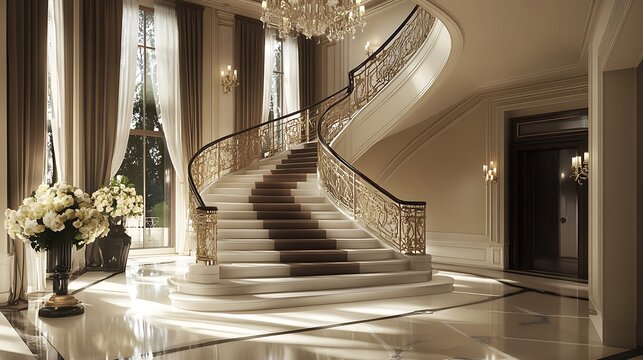 Grand staircase with a sweeping design, elegant railings, and a dramatic chandelier, creating a focal point in the home