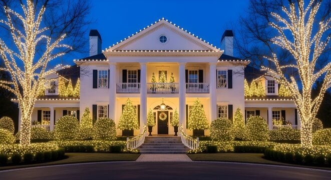 White luxury mansion exterior with grand columns and lush green garden under clear blue sky