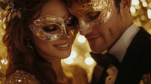 Masquerade ball costume party, guests in elegant masks and gowns, ornate chandeliers, soft candlelight, Classic, Digital