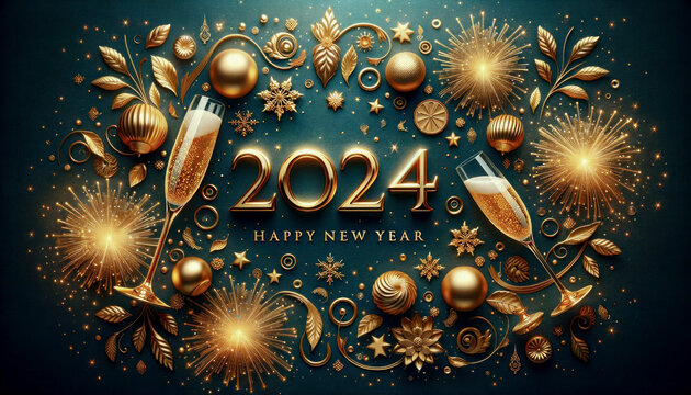Happy New Year 2024! Two glasses with champagne, ash and serpentine bokeh on a dark background