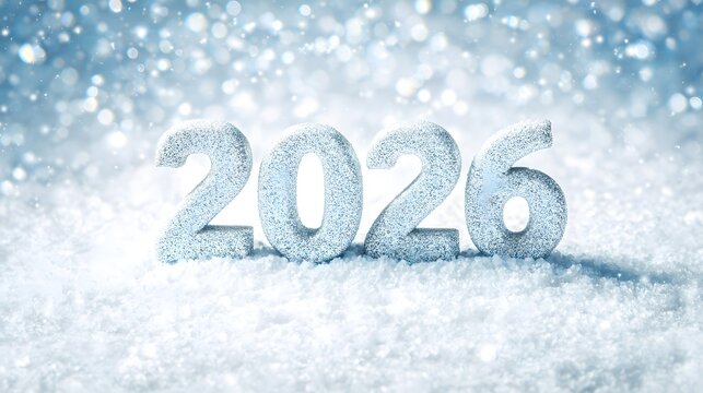 Happy New Year 2026 greeting design featuring shiny silver 3D numbers, a golden ring, and confetti on a clean white isolated background