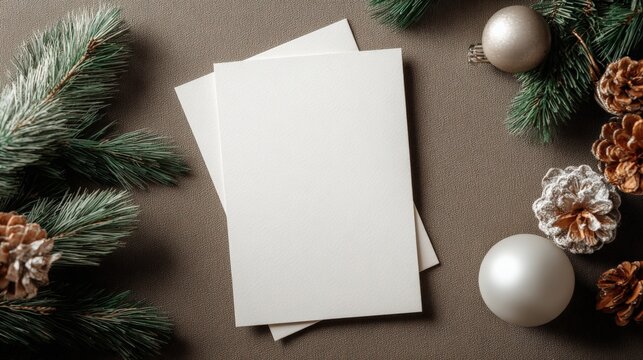 Elegant Holiday Stationery Mockup with Pine Cones and Ornaments on Neutral Background for Festive Greetings