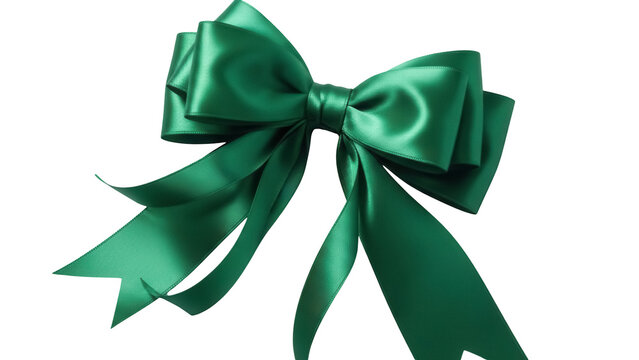 Emerald green satin ribbon bow isolated PNG on transparent background, elegant decorative element for gift wrapping and festive occasions