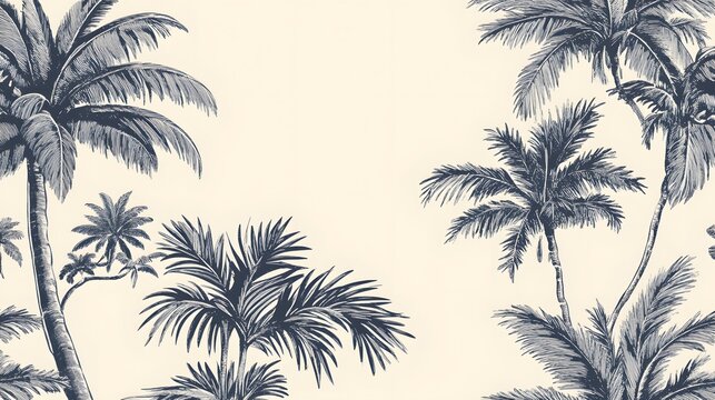 Abstract botanical art background with tropical palm leaves hand drawn in line art style. Vector banner with exotic plants for the design of wallpaper, textiles, print, interior.