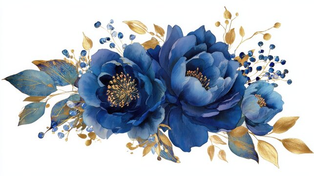 watercolor navy blue bouquet gold leaves botanical clip art drawing peonies roses herbs wedding invitation design.