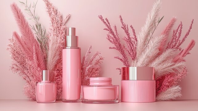 Elegant 3D Rendering of Pink Cosmetic Products in a Soft Background for Product Display and Marketing
