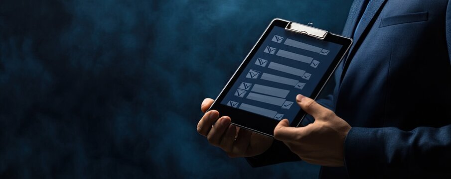 A professional man in a suit holding a tablet displaying a checklist. symbolizing productivity and organization in a dark. elegant office setting