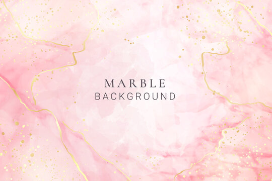 Rose pink liquid marbled watercolor background with golden dots. Dusty blush marble alcohol ink drawing effect. Vector illustration design template for wedding invitation, menu, rsvp