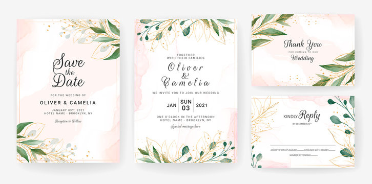 Elegant abstract background. Wedding invitation card template set with floral and gold watercolor decoration for save the date, greeting, poster, and cover design