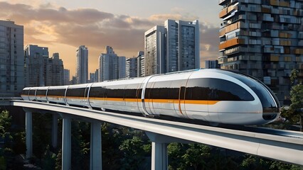 High speed train moving on an elevated track near modern city buildings, with a clear sky, for future urban transport footage.