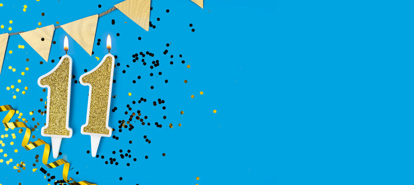 11 years birthday celebration festive background made with golden candle in the form of number Eleven lying on sparkles. Universal holiday banner with copy space.