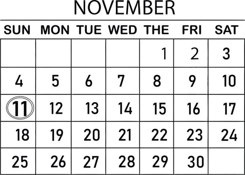 A november calendar page with the eleventh day circled on a white background in a simple style