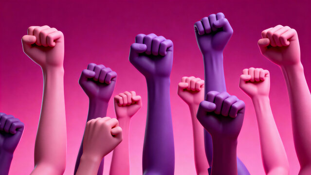 Banner with woman fists in fight. International Day for the Elimination of Violence against Women. November 25. Feminism. International Women's Day. Pink background. March 8.