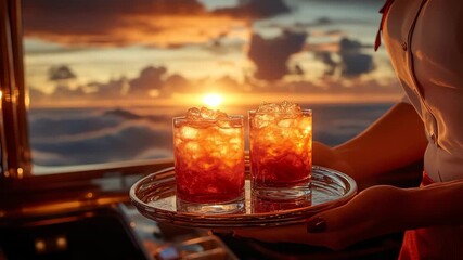 A flight attendant serves cocktails in a private jet at sunset, a scene of luxury travel and first-class service, perfect for exclusive airline commercials or corporate lifestyle promos.