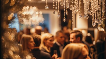 Elite Christmas gathering event with crystal decorations. Fashionable attendees networking