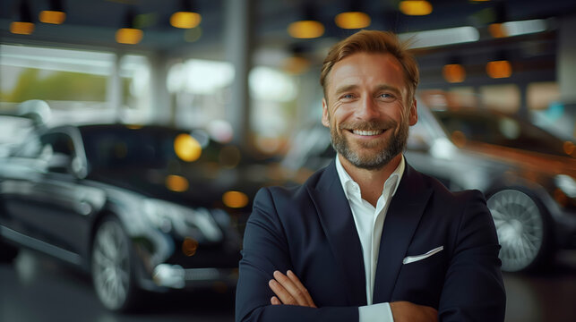 Professional Luxury Car Salesman Smiling in Luxury Showroom with Arms Crossed