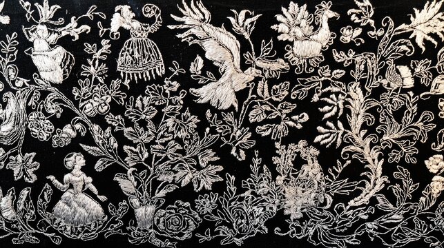 Intricate Elizabethan blackwork embroidery