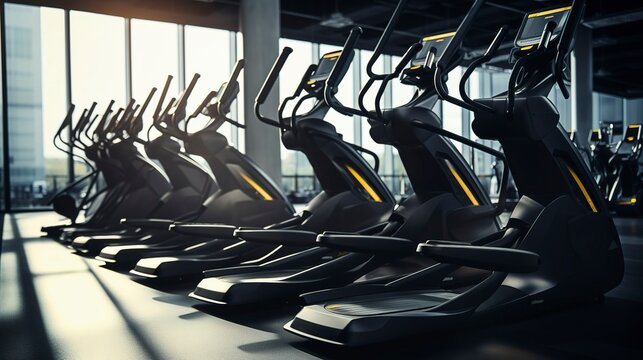 Gym exercise equipment in a fitness center.  Blurred focus on stationary elliptical trainers