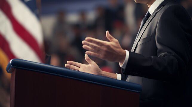 Speaker at podium with American flag, delivering speech in front of audience, wearing suit and tie, professional and formal setting.