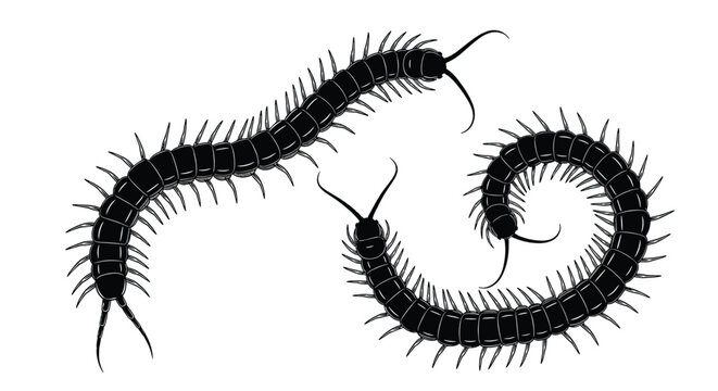 Two black centipedes or millipedes, one elongated and the other curled, depicted in a monochrome illustration.