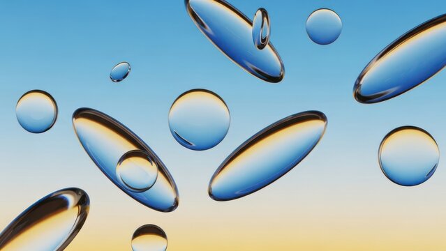 Floating, abstract, clear bubbles and elongated spheres on a gradient background
