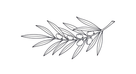 Minimalist line art illustration of an olive branch with detailed elongated leaves and clustered