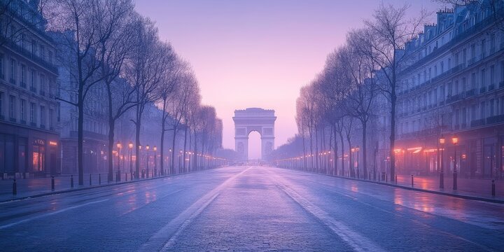 Arc de triomphe in paris at sunrise with fog illuminating champs elysees avenue