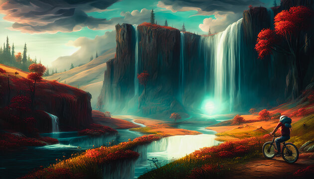 A cyclist is depicted against the backdrop of a magical waterfall. Generative AI